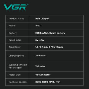 The VGR V-271 Hair Clipper combines premium design and powerful performance with Ceramic & DLC-coated blades, a 2500mAh battery, and a durable full-metal body, ideal for professional and home grooming.