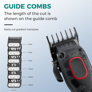 Operates cordless only, powered by a 2600mAh Li-ion battery, offering 180 minutes of runtime after a full 4-hour charge. Comes with 6 guide combs (3-6-9-12-16-19 mm) to meet all trimming needs accurately, giving you the perfect hairstyle every time.