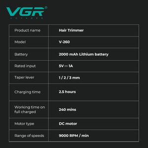 The VGR V-260 Professional Hair Trimmer is crafted for barbers and grooming professionals who demand both style and performance.