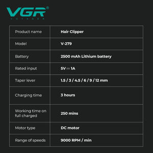 Experience high-performance grooming with the VGR V-279 Professional Hair Clipper, crafted for barbers and styling enthusiasts who demand precision and endurance.