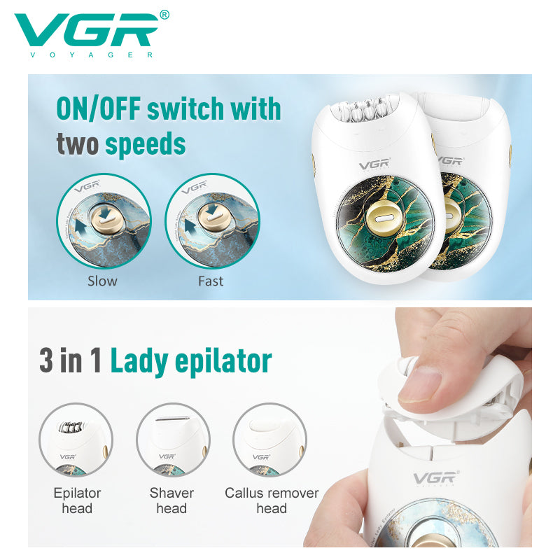 Achieve silky-smooth skin with the VGR V-736 3 in 1 Epilator, combining epilation, shaving, and callus removal in one elegant, efficient device.