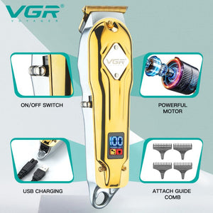 ماكينة VGR V-261 لتشذيب الشعر للرجال، بطارية 1200mAh تدوم 180 دقيقة، شفرات ستانلس ستيل، شحن USB، استخدام سلكي ولاسلكي، تصميم معدني متين مع 4 أمشاط دليلة.