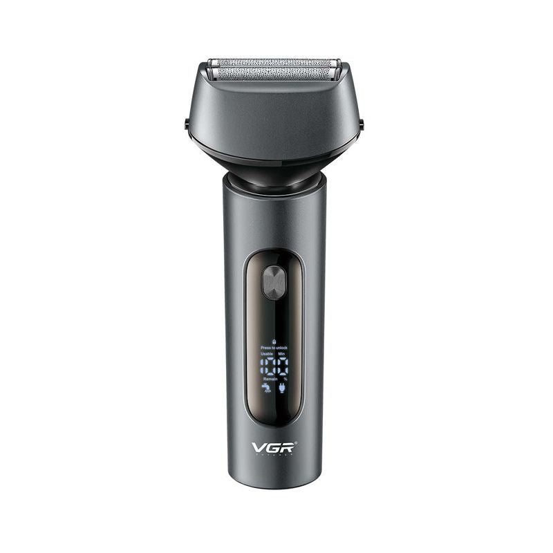 ماكينة حلاقة رجالية VGR V-381 تعمل بالشحن عبر USB، ببطارية ليثيوم أيون تدوم حتى 90 دقيقة، مزودة بشفرات ستانلس ستيل لحلاقة ناعمة ودقيقة.