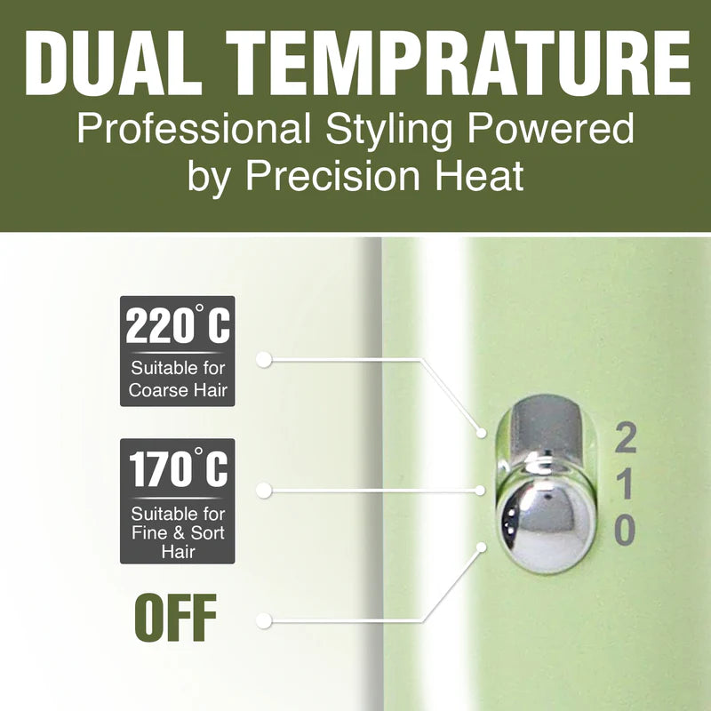 كما تحتوي على مفتاح تشغيل/إيقاف سهل الاستخدام مع إمكانية ضبط درجة الحرارة، إضافة إلى سلك دوّار بزاوية 360° يمنحك حرية حركة كاملة أثناء التصفيف.