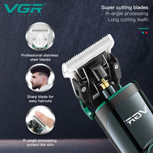 احصل على حلاقة دقيقة تدوم طويلاً مع ماكينة الحلاقة الاحترافية VGR V-671 المزودة بشفرات من الفولاذ المقاوم للصدأ وبطارية قوية تدوم حتى 400 دقيقة من التشغيل المتواصل.