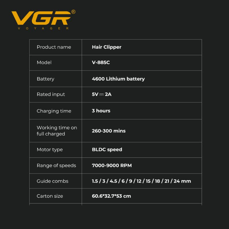 تم تصميم ماكينة الحلاقة VGR V-885C لتوفر أداءً احترافيًا لا مثيل له بفضل محركها القوي بسرعة 9000RPM وشفراتها المصنوعة من السيراميك المطلي بـDLC التي تضمن قطعًا حادًا وسلسًا مع حماية فائقة للبشرة.
